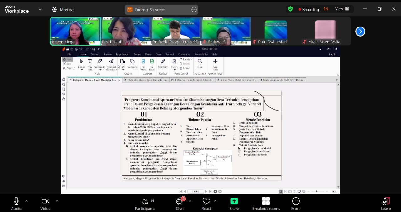 Guna menunjang diseminasi ilmu pengetahuan maka mahasiswa Program Studi Akuntansi Pascasarjana UNSRAT mengikuti kegiatan Master of Accounting Competition, 2nd Three-Minutes Thesis Competition, yang diselenggarakan oleh Asosiasi Program Studi S2 Akuntansi Indonesia (APSSAI). Indriani Suhardin dan Katryn Natania Mega mewakili Program Studi Magister Akuntansi Pascasarjana UNSRAT pada kompetisi ini